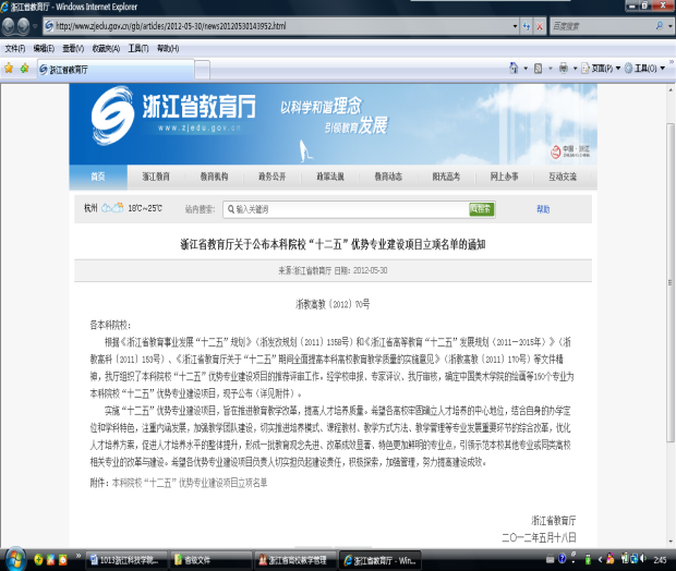 根据《浙江省教育事业发展“十二五”规划》(浙发改规划〔2011〕1358号)和《浙江省高等教育“十二五”发展规划(2011—2015年)》(浙教高科〔2011〕153号)、《浙江省教育厅关于“十二五”期间全面提高本科高校教育教学质量的实施意见》(浙教高教〔2011〕170号)等文件精神,我厅组织了本科院校“十二五”优势专业建设项目的推荐评审工作。经学校申报、专家评议、我厅审核,确定中国美术学院的绘画等150个专业为本科院校“十二五”优势专业建设项目,现予公布(详见附件)。